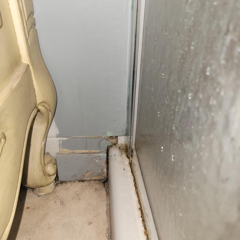 A plumber in Bel Air, Maryland diagnosed a ceiling leak caused by water escaping from cracks around a shower door and walls. The water traveled from the shower area into the ceiling below, indicating a need for sealing and structural repair to prevent further moisture damage.