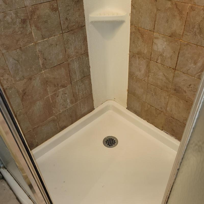 A plumber inspected a basement shower in Bel Air, Maryland. They identified a leak near the faucet plate and sealed it using 100% silicone caulk. The technician also tested the shower pan with water and confirmed no active leaks.
